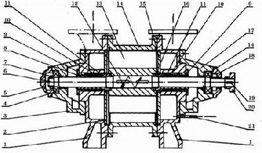 1.端蓋2.排氣園盤3.后軸承架4.軸承5.后軸承城市蓋6.軸7.園螺母8.后軸套9.填料壓蓋10.填料壓圈11.填料12.平鍵13.葉輪14.泵體15.吸氣園盤16.前軸套17.前軸承架18.前軸承壓蓋19.平鍵20.聯軸器21.進水管